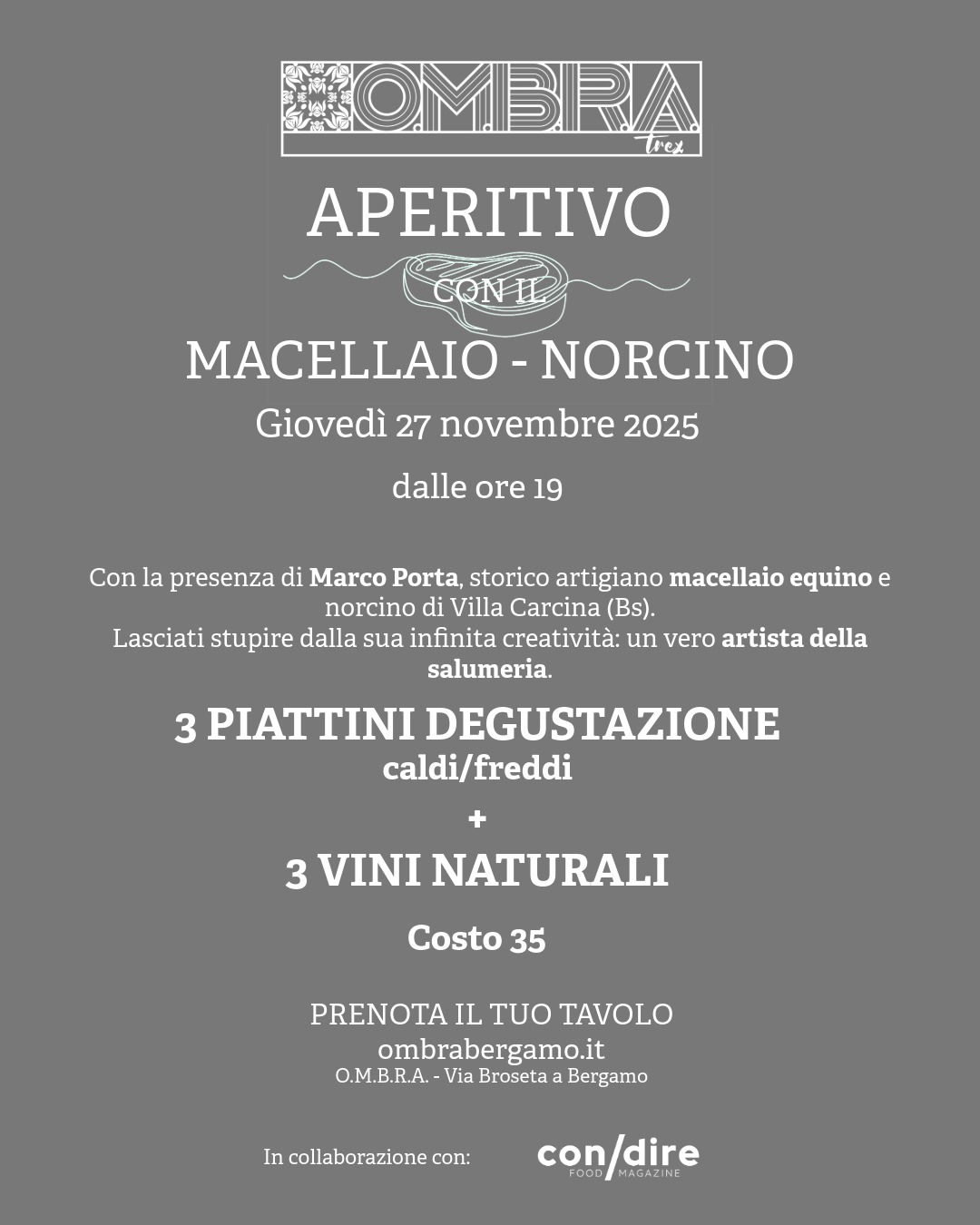Insomma, giovedì 27 novembre a O.M.B.R.A. potrai fare un aperitivo inusuale. Dai salumi affettati direttamente da Marco, che sarà presente per fare due chiacchiere con voi, fino alla sua carne salata, che serviremo tiepida e accompagnata da una generosa salsa verde. Infine, il cotequino cotto, glassato con una salsa al vin brulè sopra a una cucchiaiata di purè di patate.